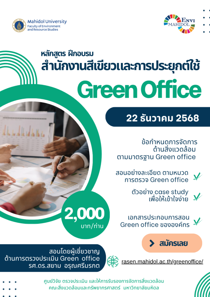 สำหรับ พนักงานมหาวิทยาลัย ข้าราชการ เจ้าหน้าที่จากหน่วยงานภาครัฐและเอกชน หรือผู้เกี่ยวข้องในการตรวจประเมินการจัดการสิ่งแวดล้อม Green Office และผู้ที่สนใจทั่วไป